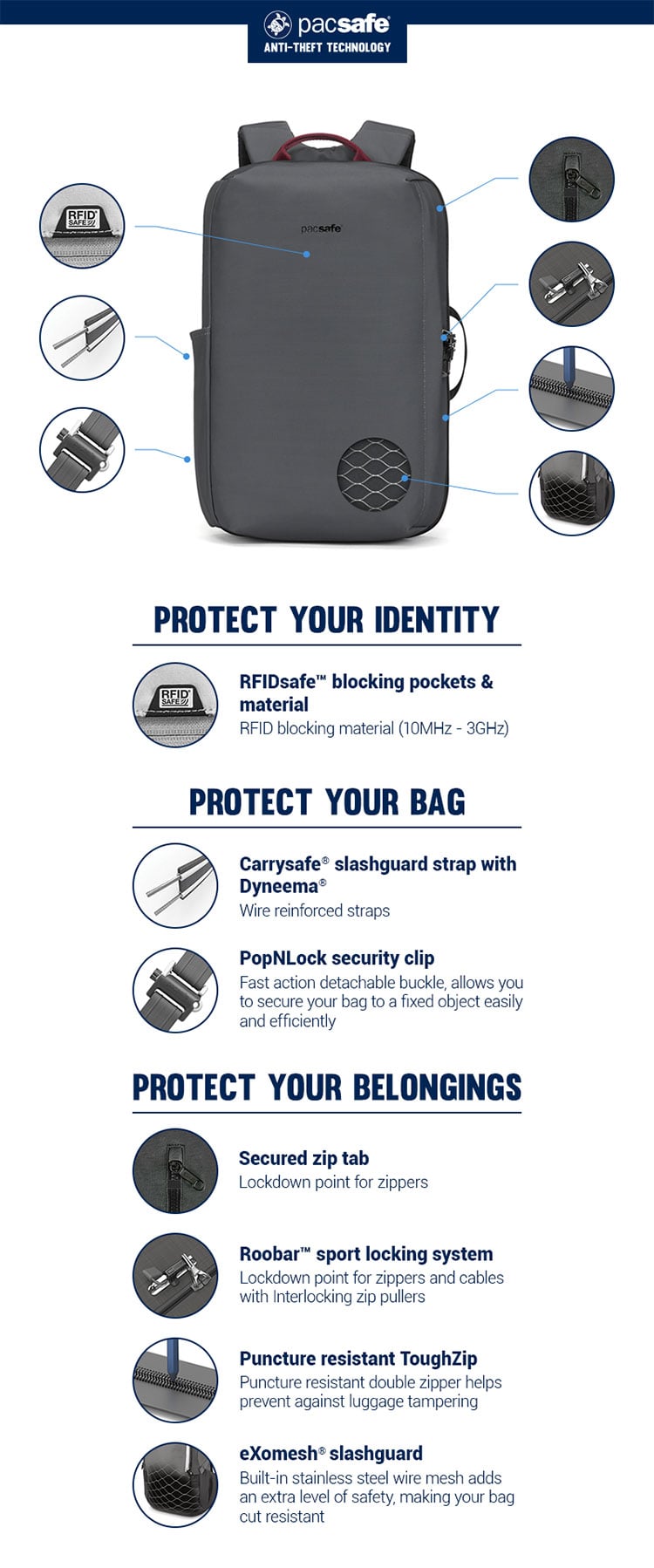 The slim profile allows for easy movements through busy areas such as subways, city streets, and the airport, making it the perfect companion for city dwellers and commuters. The 18L capacity of this anti-theft backpack holds more than you think, with separate padded compartments for a 16" laptop and 11" tablet, and several internal pockets for your gadgets, cables, and on-the-go gear. The unique sideways wide opening also makes it very easy for you to access your belongings with minimal hassle. Not only is the bag packed with function, it's packed full of Pacsafe security features.
