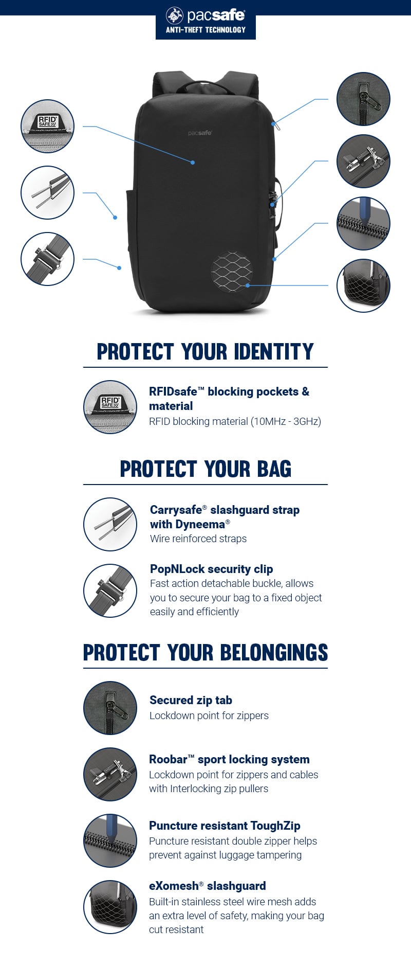 The slim profile allows for easy movements through busy areas such as subways, city streets, and the airport, making it the perfect companion for city dwellers and commuters. The 18L capacity of this anti-theft backpack holds more than you think, with separate padded compartments for a 16" laptop and 11" tablet, and several internal pockets for your gadgets, cables, and on-the-go gear. The unique sideways wide opening also makes it very easy for you to access your belongings with minimal hassle. Not only is the bag packed with function, it's packed full of Pacsafe security features.