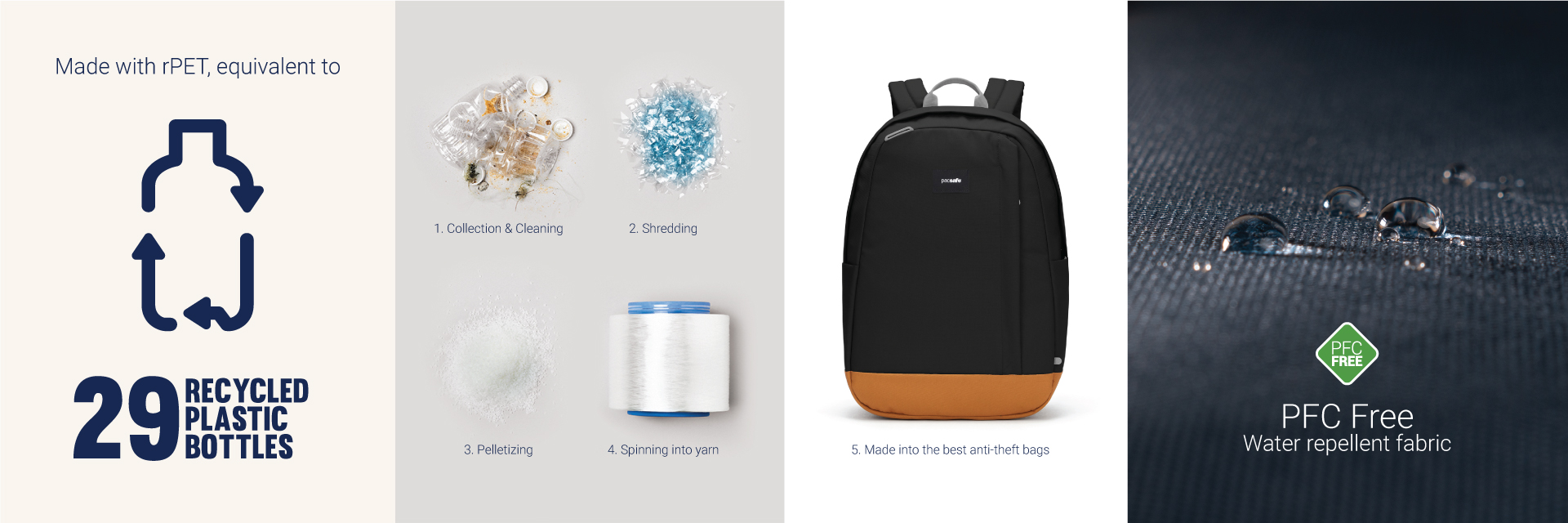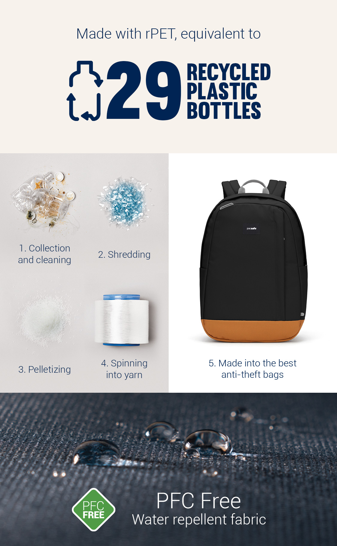 This product is made with post-consumer recycled polyester (rPET), equivalent to 29 recycled plastic bottles, and is treated with a 100% PFC-free water repellency.