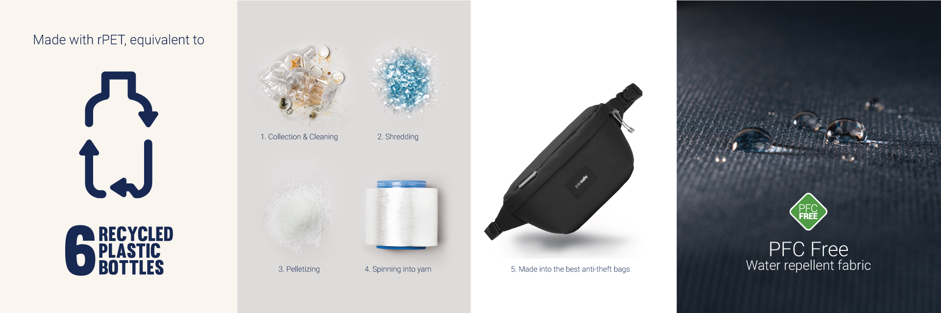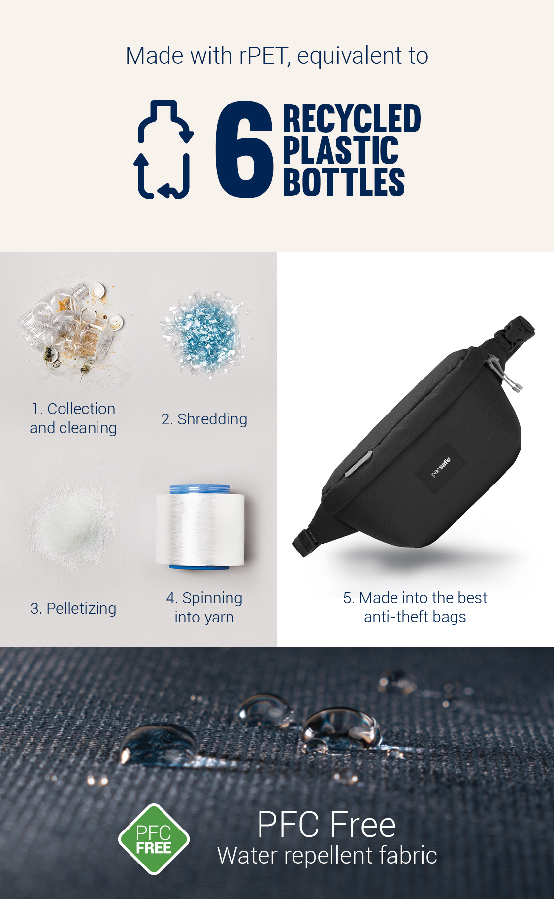 This product is made with post-consumer recycled polyester (rPET), equivalent to 6 recycled plastic bottles, and is treated with a 100% PFC-free water repellency.