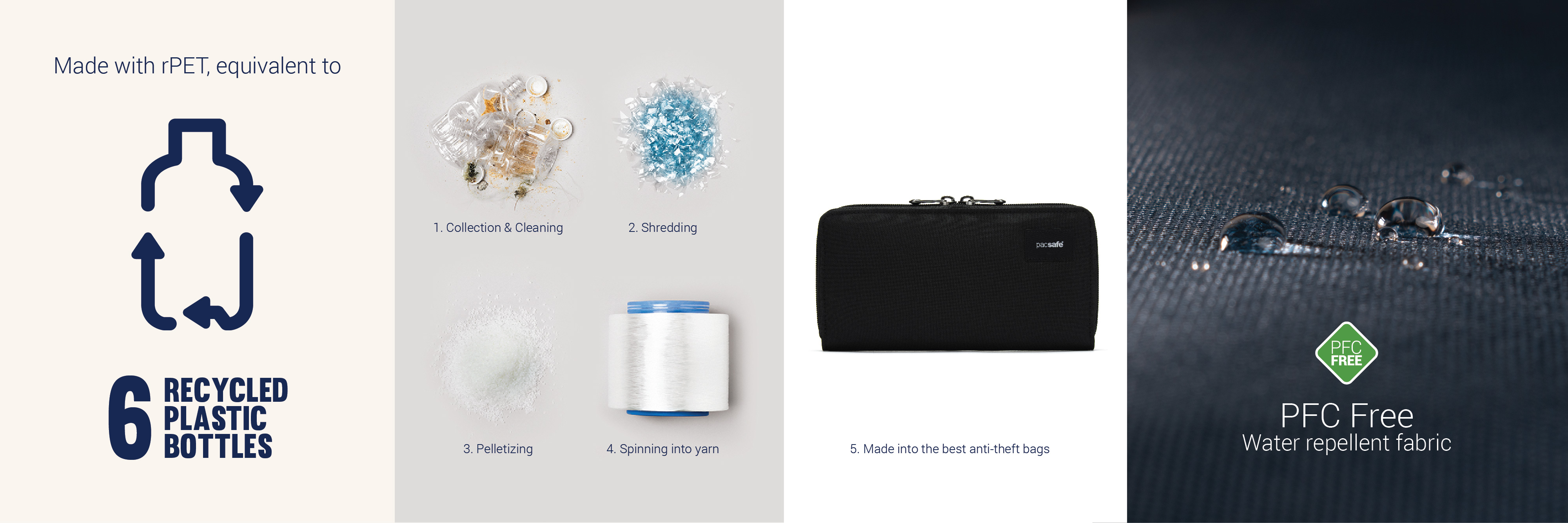This product is made with post-consumer recycled polyester (rPET), equivalent to 6 recycled plastic bottles, and is treated with a 100% PFC-free water repellency.