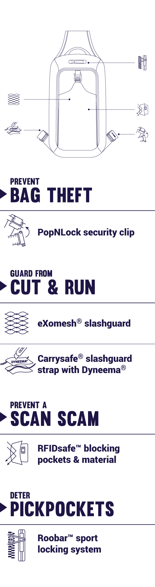 • Cut-resistant anchor strap locks around a fixed object to protect your bag